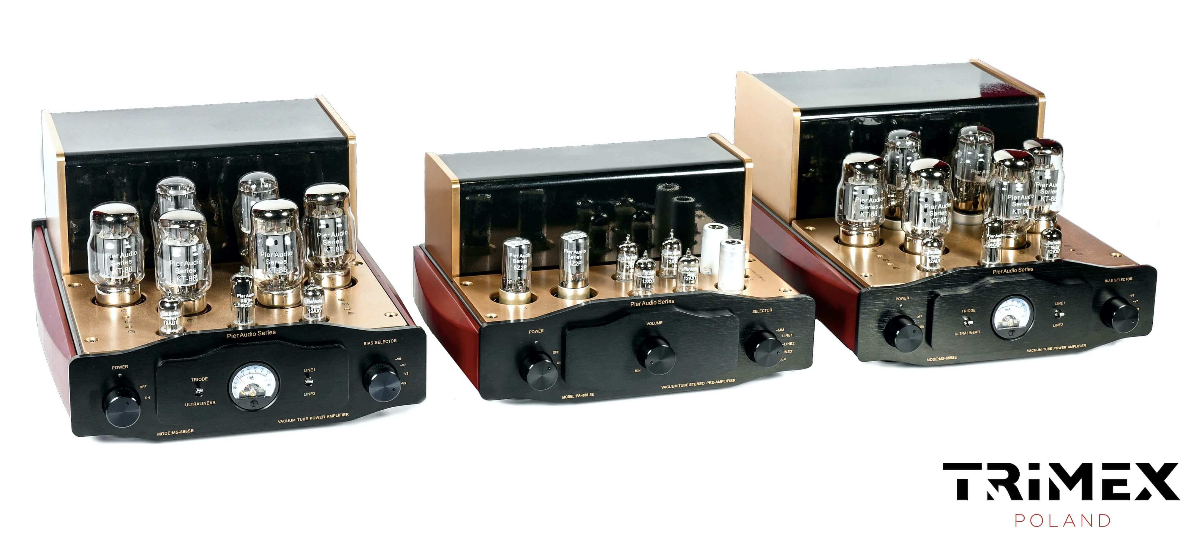 Zestaw Pier Audio PA-888 SE (przedwzmacniacz) oraz dwa monobloki MS-888 SE jest zwieńczeniem wielu lat poszukiwań i badań ukierunkowanych na stworzenie zestawu, który byłby odpowiedzią na rosnące potrzeby wymagającego rynku audio na całym świecie. Zestaw ten oferuje 80W na kanał „wyciśniętych” z lamp KT88 (jedna kwadra na każdy monoblok), który w związku ze swoją „niebotyczną” efektywnością prądową jest w stanie wysterować absolutnie każdy zestaw głośnikowy na rynku! Zestaw ten cechuje podobna linia melodyjna co prezentowana we wzmacniaczu MS-88 SE, jednakże dźwięk reprodukowany przez ten zestaw powala szerokością i głębokością sceny dźwiękowej. Perfekcyjnie obrazuje wydarzenia na scenie muzycznej, powoduje niemalże „pojawienie się” artystów każdego z osobna, przy zachowaniu wyjątkowej spójności i niespotykanej stereofonicznej separacji pomiędzy lewym a prawy kanałem. Dzięki takiej konstrukcji żadne stereofoniczne nagranie nie brzmi monofonicznie, a monofoniczne jest niejako spotęgowane niezwykłą siłą przekazu. Zastosowanie lamp KT88 w układzie PUSH-PULL zapewnia doskonały balans między dużym zasobem energetycznym generowanym przez monobloki, a ich barwnym, pełnym transjentów przekazem. Góra pasma jest precyzyjna, szybka, i niezwykle przyjazna dla ucha, średnica „uwodzi” swoją naturalnością i namacalnością partii wokalnych (szczególnie podczas prezentacji wokali żeńskich), a bas jest kilkustopniowy, sprężysty, doskonale kontrolowany i pełen narkotycznego kolorytu.